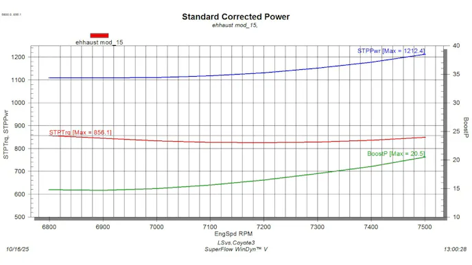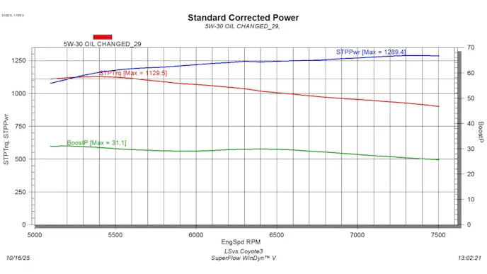 A quick plug change and some work on the fueling tables saw the highest Coyote horsepower number ever to be recorded in LS vs. Coyote history at 1,347 horsepower and 1,069 lb-ft of torque. However, Team FFRE wasn’t done. They still hadn’t played with ignition timing. They also had another trick up their sleeve, in the form of another oil change, this time going to 5W-20.