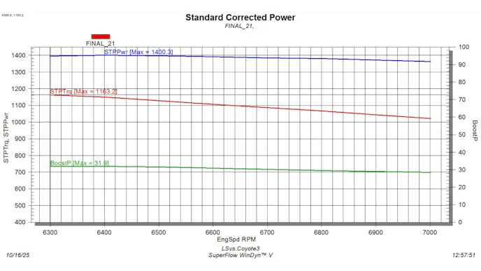 Peak torque was 1,163.2 lb-ft and came in right at the start of the run (at 6,300 rpm) and likely would have been higher had the pull started earlier, but the horsepower was already rolling over, so there would have been no horsepower benefit to starting the run earlier. The LME team was satisfied with that number, and we were at the end of the day, so it was officially called for the LME entry at 1,400.3 horsepower.