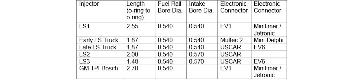 We’ve also created a chart listing all the physical injector dimensions. Combined with the accompanying images, the chart is probably the easiest way to differentiate and make sense of all the different GM injectors.