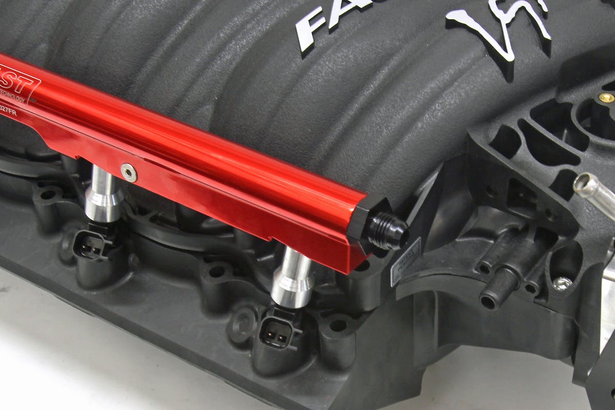 (Left) ICT makes swapping injector heights a little easier with these injector adapters. In this case, the ICT adapters convert the short LS3 injector to the height of the tall LS1 style. ICT Billet also makes two shorter adapters, one to adapt the short LS3 to the FAST LSX intake and third set that adapts LS1 to LS3 intakes. (Right) To show how the fuel adapters work, we placed these LS3 style FAST 65 lb/hr injectors on a FAST LSXr intake. The intake is designed to accommodate the taller injectors so we added the intermediate ICT Billet rail adapters. The FAST manifold also requires the larger lower O-rings, which are supplied with the manifold. Be careful with these adapters to ensure there are no fuel leaks at the rail.