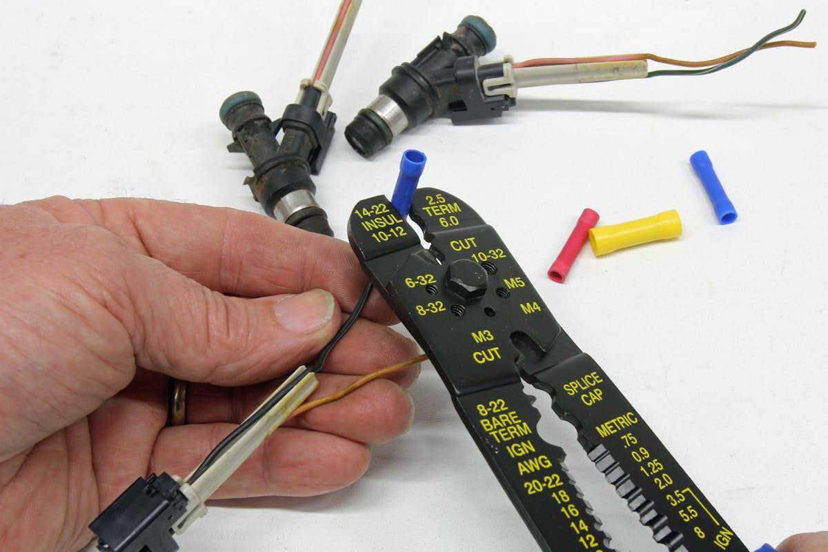 (Left) Wiring pigtail adapters allow you to use existing injectors with a different harness. These FAST pigtail connectors allow using the older Bosch Jetronic EVI injector with a later harness designed for EV6 injectors. (Right) We’ve seen injector harnesses spliced with cheesy butt connectors using different size wire. While this might work as a temporary fix, even the smallest amount of resistance in the circuit can affect injector performance. It’s best to avoid homemade wiring splices and use dedicated adapters