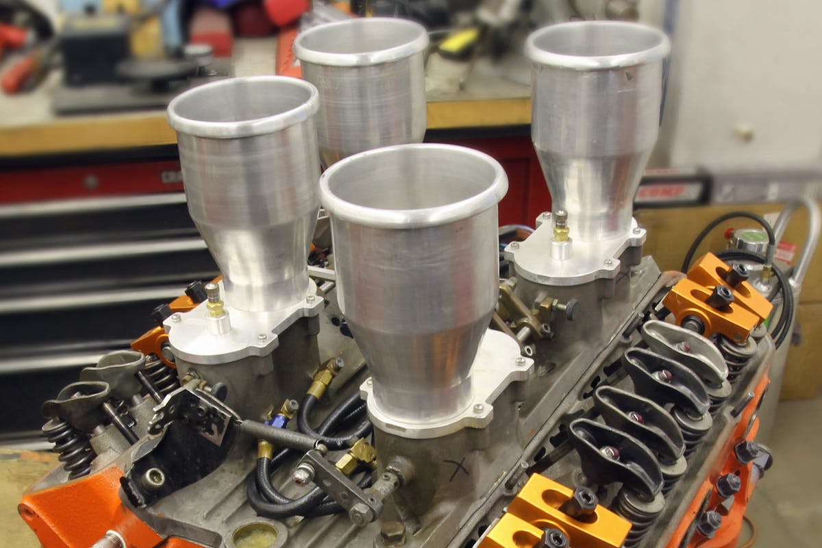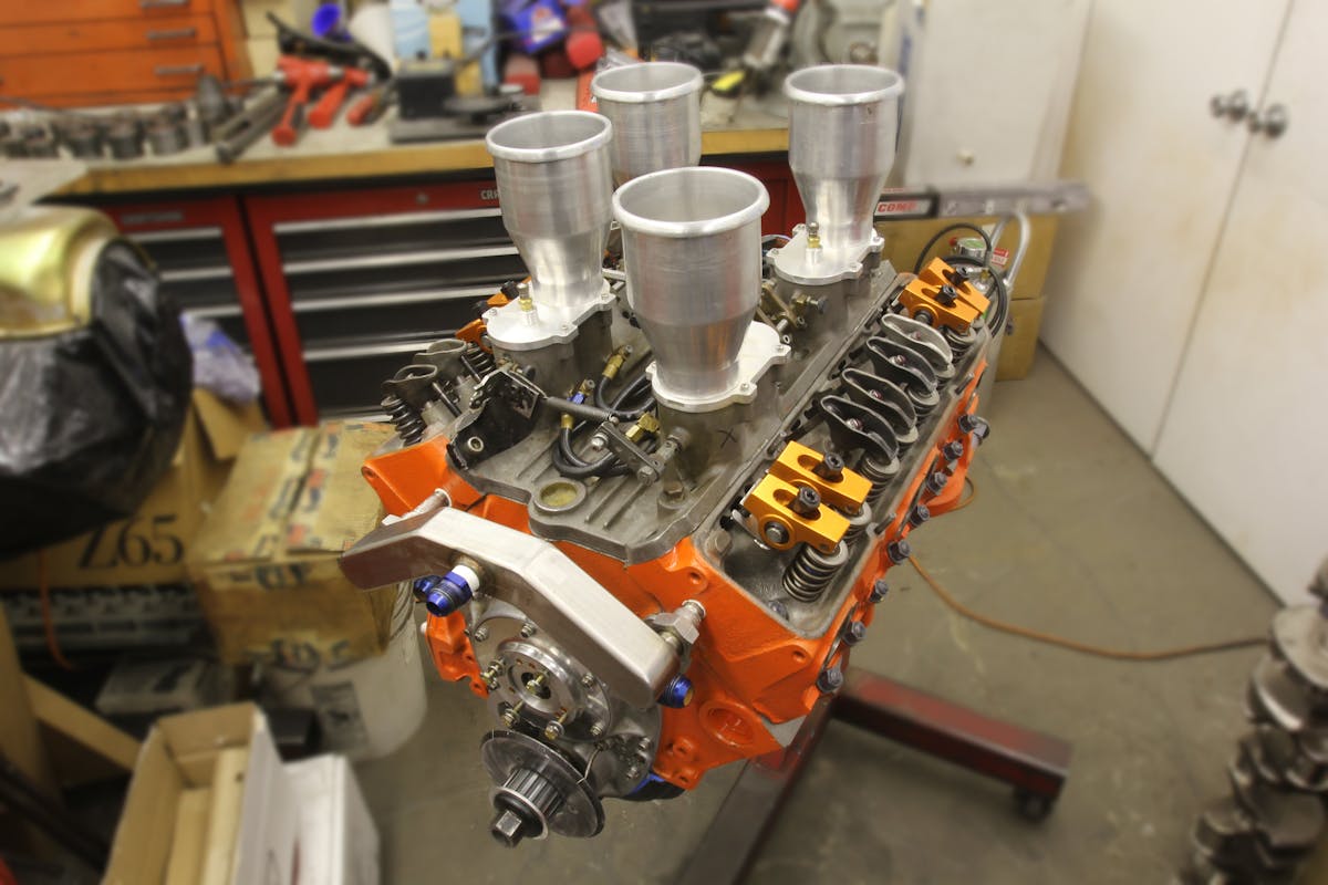 Short of the Arias pistons and GRP aluminum rods, the Hilborn mechanical fuel injection might be the most exotic, race-inspired part on the entire engine. Externally, the dead giveaway to this V4’s true identity are the manifold block-off plates covering the unused intake runners. Just like a standard SBC, the mechanical fuel pump bolts to the front of the cam cover and will supply the required load of nitromethane.