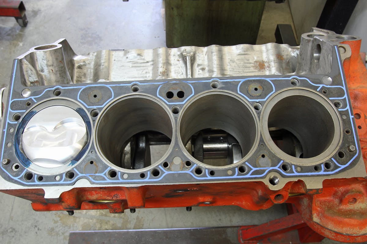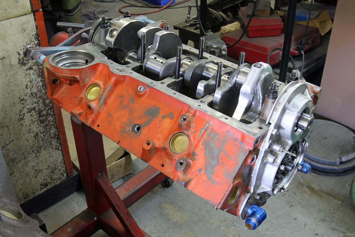 We learned about this distinctive little small-block from Don Barrington, Jr. at Barrington Machine in Valencia, California. He performed the cylinder sleeve machining and installation and assembled the little V4. The really interesting part of this is the orientation of the firing order. A small-block Chevy firing order is 1-8-4-3-6-5-7-2. Willie’s four-banger employs the outboard cylinders 1 and 7 on the driver side and the inboard cylinders on the opposite bank with holes 4 and 6. With a firing order of 1-4-6-7, this fires a cylinder every 180 degrees. While that does concentrate the paired firings of cylinders 4 and 6 on the even side of the block, it was necessitated by the stock firing order.