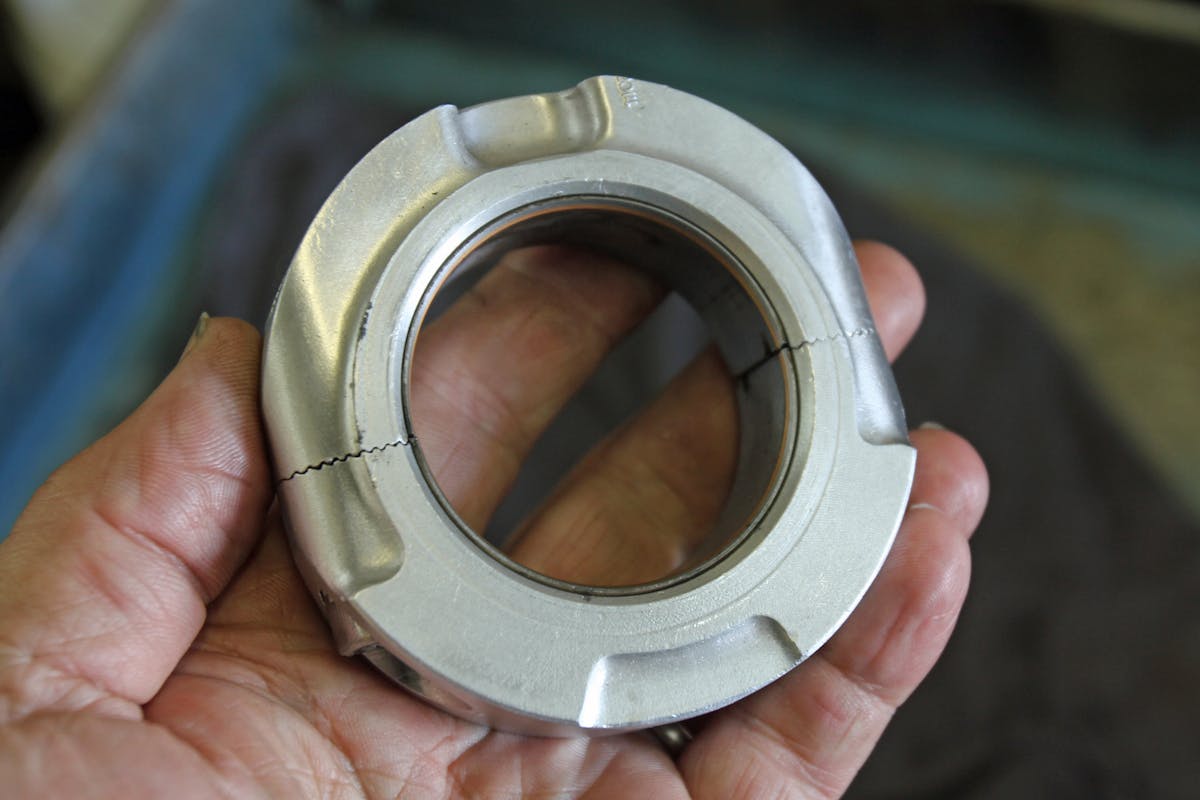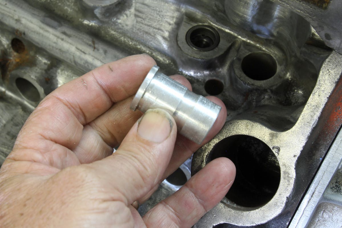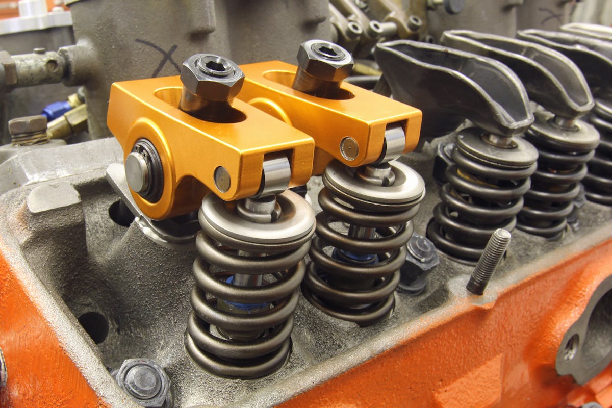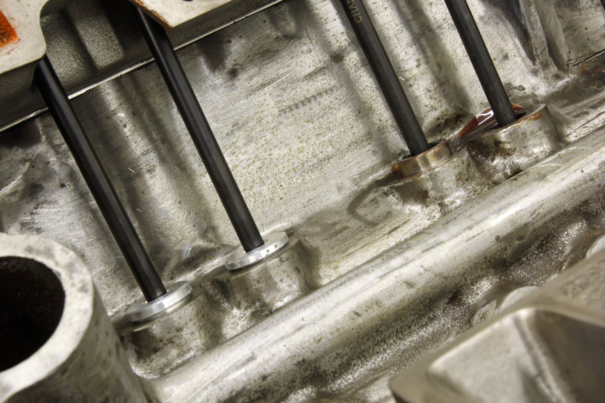The valvetrain is also relatively simple with just a set of Manley valvesprings with 130 pounds on the seat and 330 pounds open load, working with a vintage set of titanium retainers to minimize the inertial forces. The springs are still only 1.250-inch diameter because Barrington noted these heads don’t allow opening up the spring pocket. Doing so on these heads results in hitting the water jacket. The rockers are a set of Harland Sharp 1.6:1 rockers and there’s no current plan to add a stud girdle.