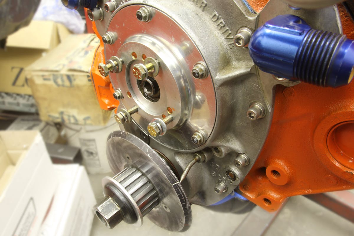 Ignition for this unique setup has been a challenge for Freudiger in the past. In the previous engine, he used an eight-cylinder magneto that fired four plugs bolted to the firewall. For this effort, Freudiger came up with a four-cylinder motorcycle magneto from a 350cc Honda that has been adapted to the lower portion of small-block Chevy distributor. Tom Cirello of Cirello Magnetos modified this package with better magnets and this promises to help keep the candles lit at full boogie.
