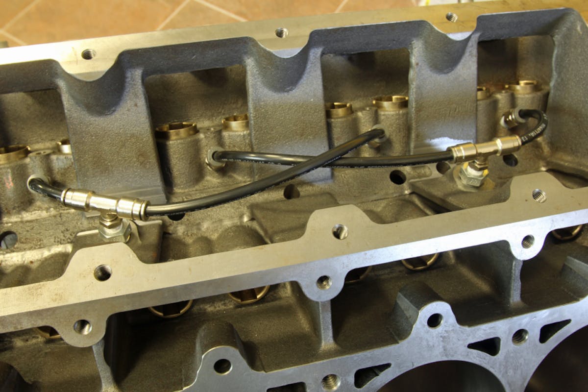 Another advantage to the lifter bushings is they can be customized to restrict oil flow. The stock lifter oil passages in the LS block are 5/8-inch but these new bushings reduce that diameter to a much more manageable 0.125-inch. Much of this effort is aimed at reducing the oil flow across the entire engine including the use of restricted pushrod passages. However, oil is still important for cooling the valvesprings, so Strader has also added spray bars in the billet valvecovers to spray a cooling mist of oil on the springs.