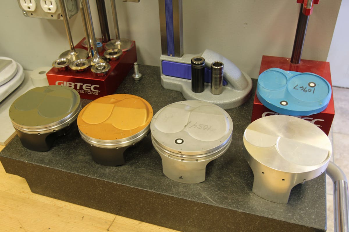 Moving to the pistons, The Gibtec billet pistons are under constant development, so there weren’t any finished pieces for us to photograph. Strader says he is shooting for a 16.5:1 compression ratio. His CED class has tested ratios as high as 17.8:1 but found the small power increase was offset by a combination of sensitivity to ignition timing with even minor changes in atmospheric conditions, as well as increased maintenance issues. In essence, it was living too close to the edge.