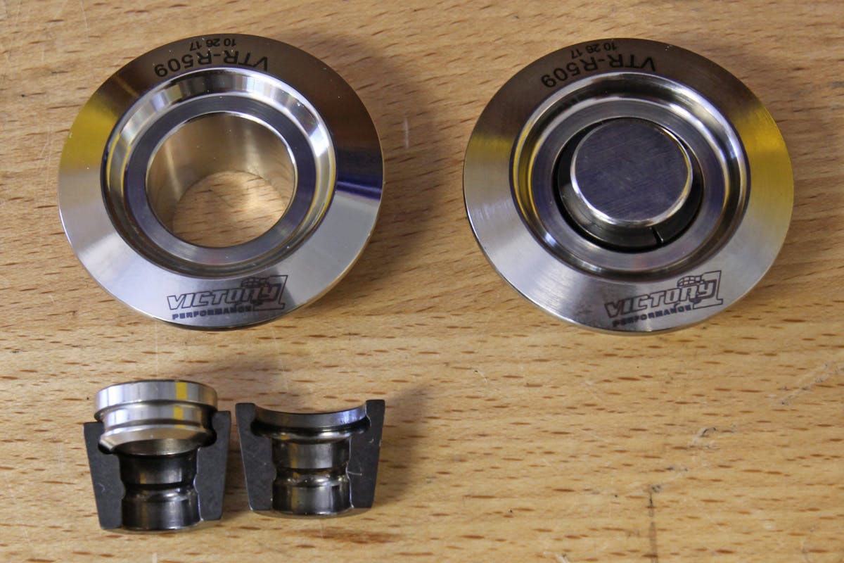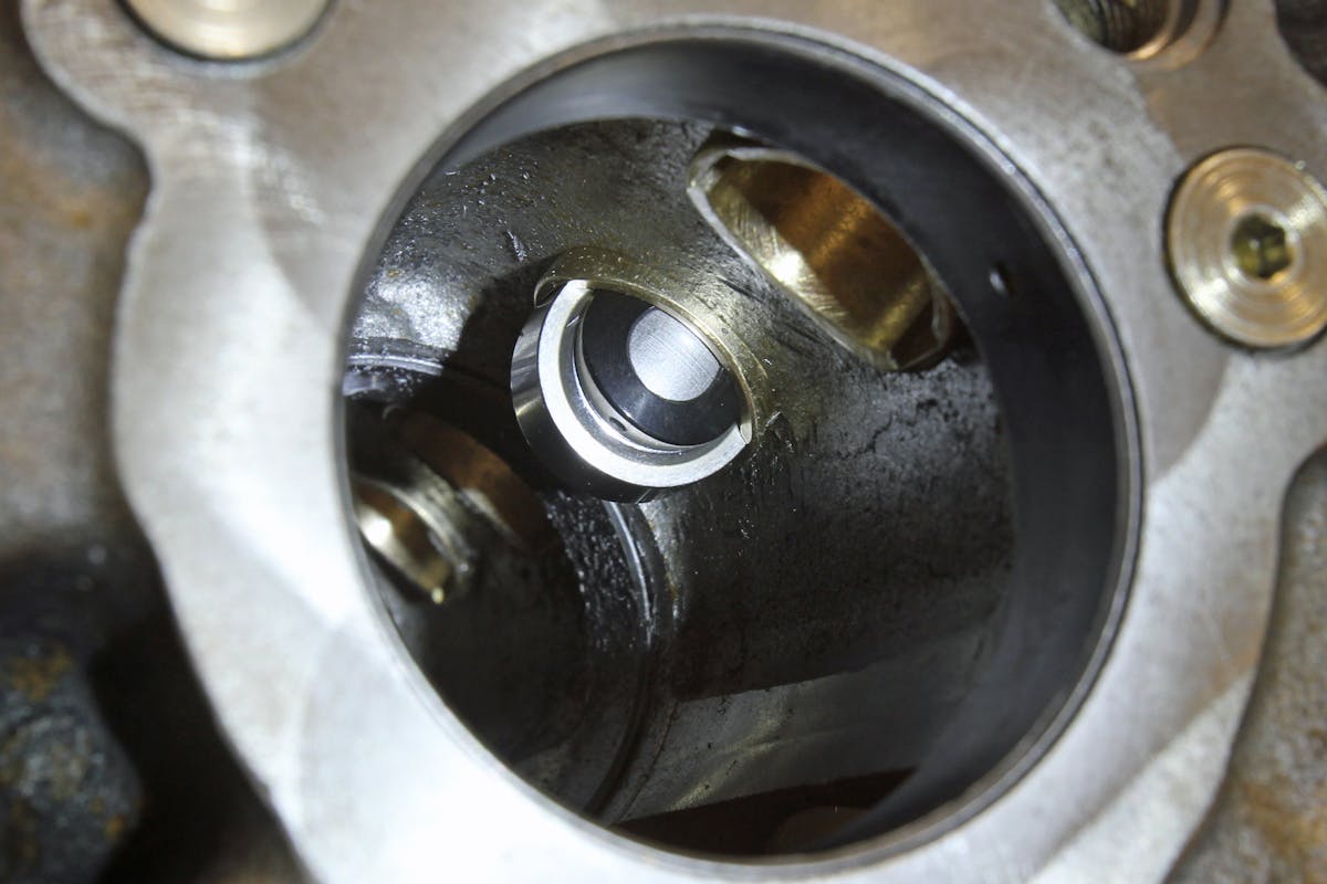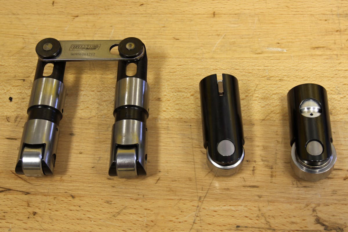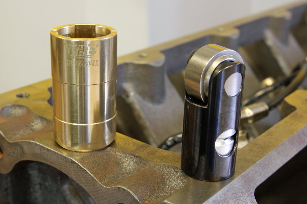 There’s a much more detailed story around this, but a larger core allows a larger and more stable base circle, which then offers opportunity for additional lobe lift, which can take advantage of a larger lifter wheel. All of this is aimed at improving stability at all engine speeds. Strader took this notion and applied it in order to generate the largest wheel possible, which reduces the pressure angle on the lifter. This led to a set of Jesel roller lifters with a wheel larger than the lifter body itself. This is called a wheel-located lifter, which eliminates the traditional lifter tie-bars, thus reducing weight. The larger-diameter wheel slips into slots cut into the lifter bore bushings that guide the wheel and prevent the lifter from spinning in the bore.