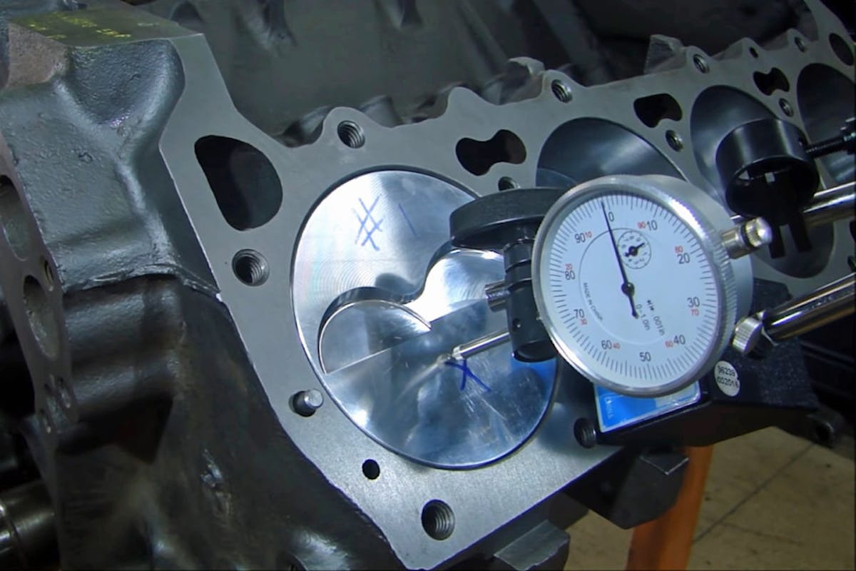 As Pete covers in the video, the first step is to rotate the crank so that the number-one piston is slightly below it’s peak travel, on the upstroke. Then, with a dial indicator set up indicating on the crown of the piston, rotate the crank until the piston is at the absolute peak of its upward travel..