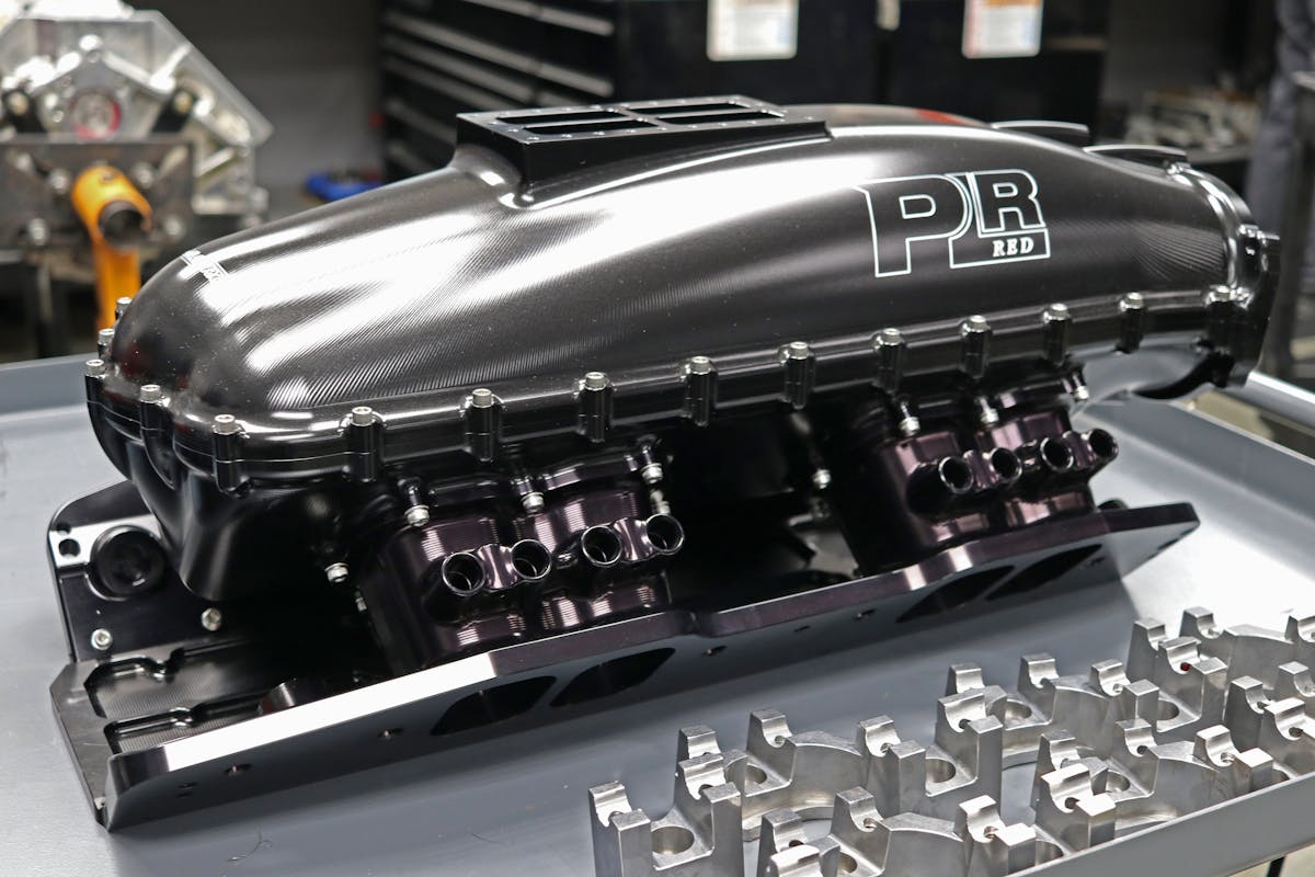 This awesome billet intake manifold has been designed specifically for the Red engine program and its large amount of boost and nasty methanol habit (notice the dual injector bungs).