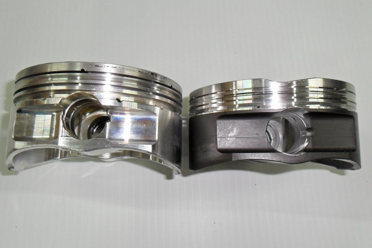 Moving into the bottom end, the cylinder sleeve bore measured in at 4.157 inches. They did have some wear but cleaned up with a .001-inch hone. That gave us a final bore of 4.158 inches, and saved us from having to re-sleeve the block. The original pistons were manufactured by Diamond Racing Pistons, and Diamond was able to make us another set for the .001-inch-larger bore. We also took the opportunity to make some additional changes to the pistons.