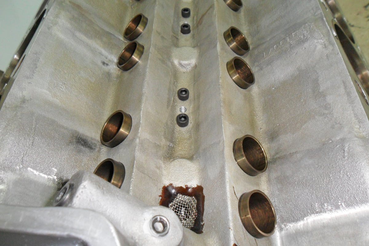 The “low-shock” design changes the way it opens and closes the valves, while maintaining intensity, to reduce shock loads on the valvetrain. The camshaft was ground with a lobe separation of 107 degrees with a 265- degree intake and 275-degree exhaust duration at.050 inch of lift, with a .750-inch of valve lift. The lifter bores were bushed for .930-inch diameter Crower solid-roller lifters which have a .850-inch diameter wheel. The lifters had been replaced in the last refresh, so they were reused.