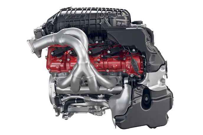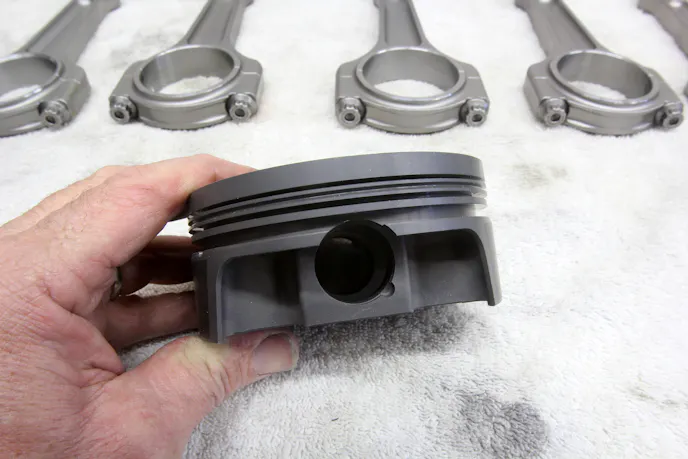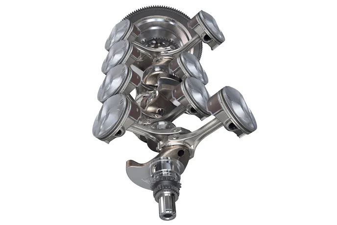 Another variable that affects secondary vibration in flat-plane crank engines is the weight of the piston and rod assembly. In the case of the new GM LT6, they employed a short skirt, forged-alloy pistons combined with titanium connecting rods, both to reduce reciprocating weight, which allows the engine to rev quicker, but also to help reduce the effect of secondary imbalance.