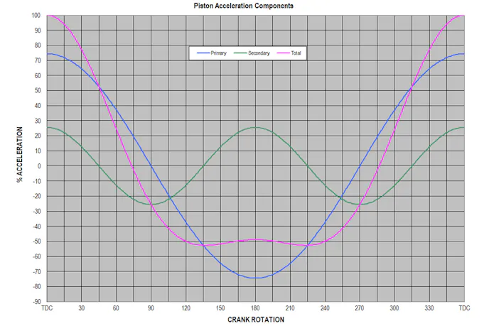 When the crank pin arrives at 90-degrees After TDC (ATDC), the piston has actually traveled farther than halfway due to this effective shorter connecting rod. Then from 90-degrees of the crank pin to Bottom Dead Center (BDC) of the crank pin, the piston travels a shorter distance. This discrepancy in travel distance (and resultant differing acceleration forces) creates what is called a secondary vibration.
