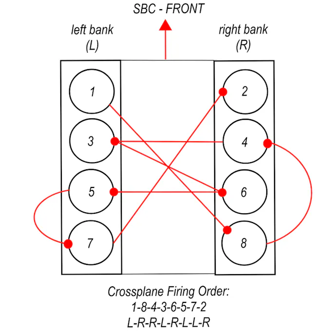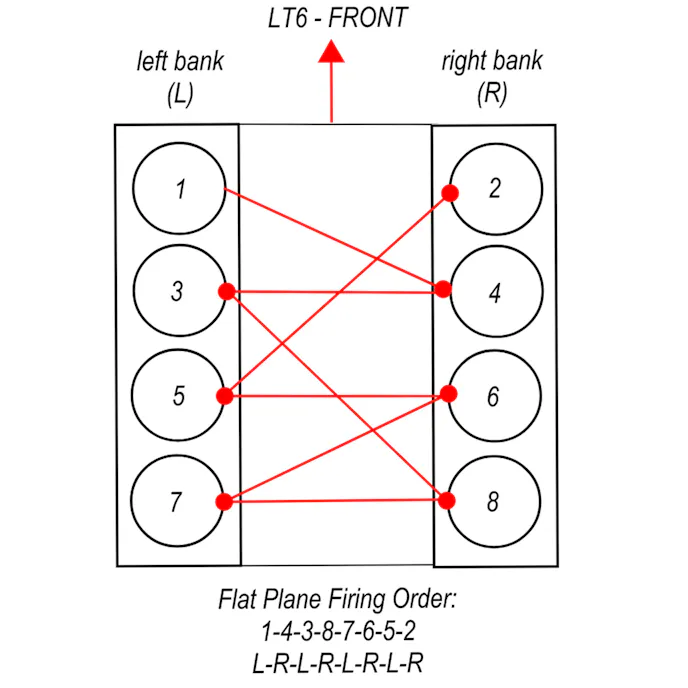 A cross-plane crankshaft does not enjoy this advantage. We’ve included drawings of both a flat-plane crank and cross-plane crankshaft cylinder firing to reveal this much more succinctly than we could with a lengthy written description. But in essence, with a cross-plane crankshaft, the sequencing of the pistons reaching TDC produces a firing order in which two cylinders in each bank fire sequentially.