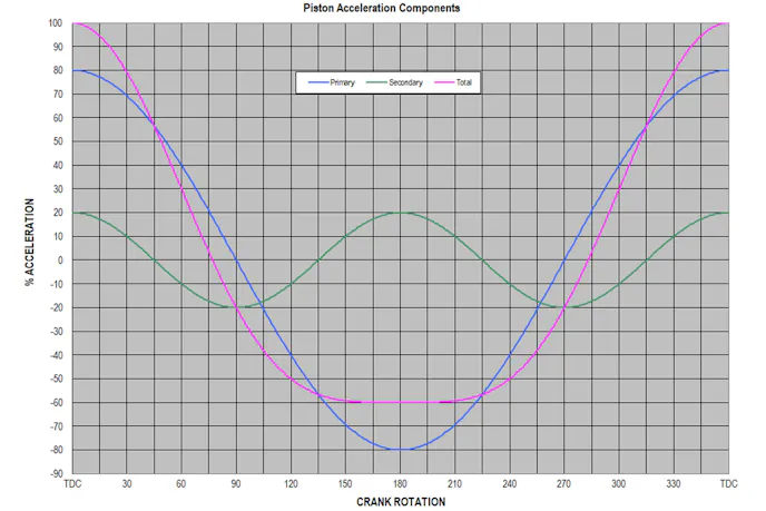 When the crank pin arrives at 90-degrees After TDC (ATDC), the piston has actually traveled farther than halfway due to this effective shorter connecting rod. Then from 90-degrees of the crank pin to Bottom Dead Center (BDC) of the crank pin, the piston travels a shorter distance. This discrepancy in travel distance (and resultant differing acceleration forces) creates what is called a secondary vibration.