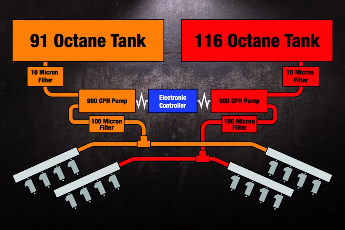 So, it was with interest that we followed a recent build of a 474 ci. LS powerplant destined to be installed in a 1971 Firebird that will primarily be street driven — with occasional drag strip duty. As such, Nelson is utilizing an “octane on demand” system that employs two fuel cells; one filled with standard 91-octane pump gas for cruising and the other with 116-octane race fuel for when boost reaches a predetermined level. More on that later.