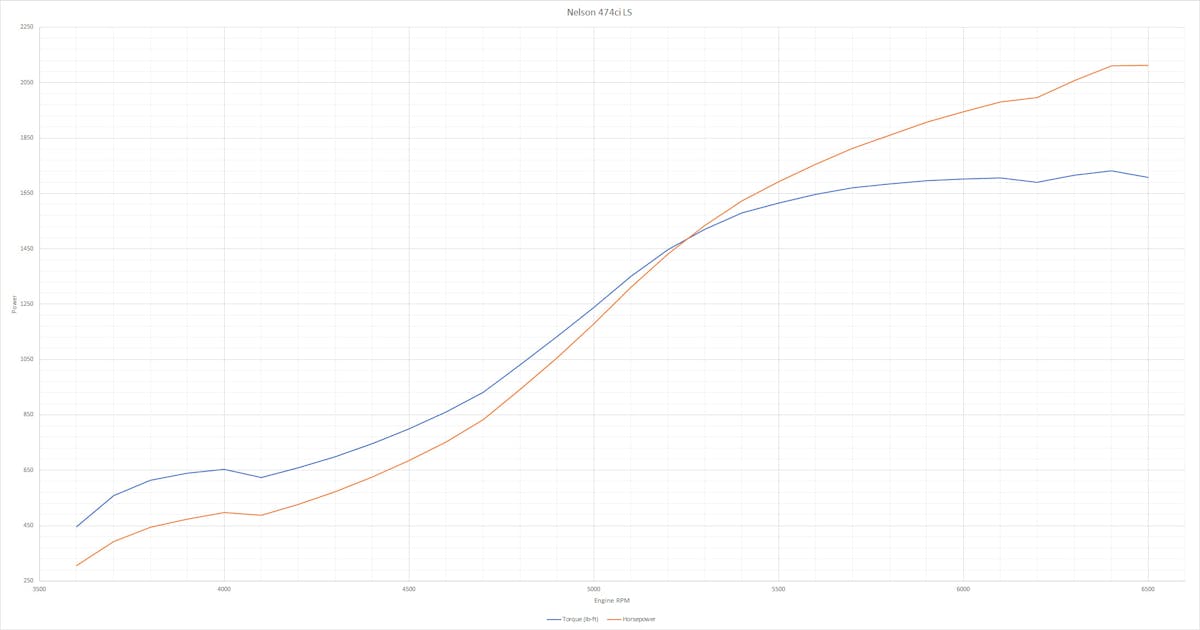 Given the boost-to-power progression and experience from multiple similar builds, Nelson is confident that the engine is capable of well over 2,000 horsepower when it crosses the 30 psi threshold. That said, the engine’s owner has put a moratorium on “turning up the wick” for testing and Nelson honored his wishes. However, a recent build with essentially the same combination netted 2,113 horsepower at 6,500 rpm with torque maxing out at 1,732 lb-ft at a peak of 32psi.