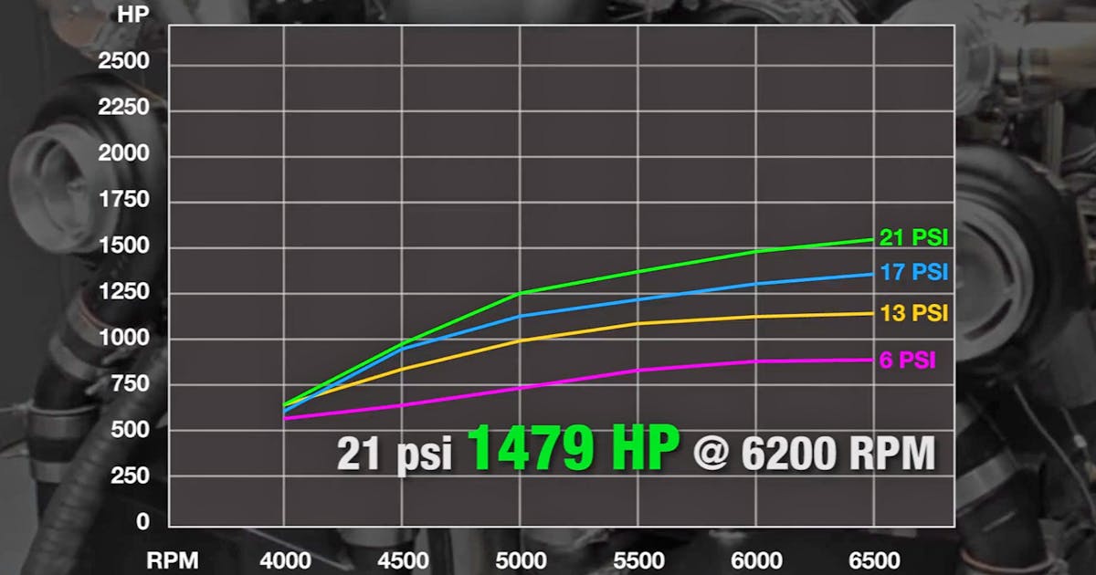 Upping the boost to 13 pounds saw 1,153 ponies at 6,400 rpm, and with the boost upped to 17 pounds, 1,300 horsepower was generated. It’s at this point the 116-octane gasoline typically takes over. Next on the agenda was 21 psi, with the dyno pegging at 1,479 horsepower at 6,200 rpm, with a peak torque of 1,315 lb-ft of torque generated at 5,200 rpm.