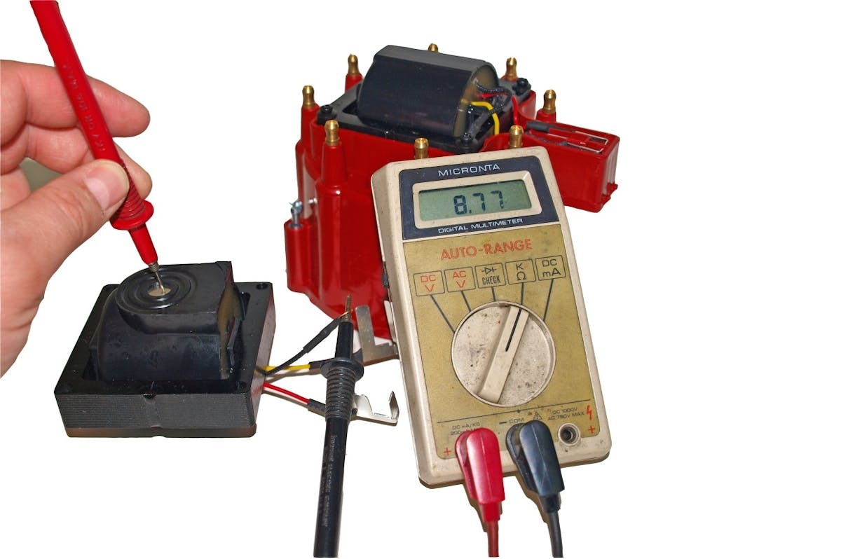 Although failure after leaving the facory and before installation is rare, two of the distributor's components can be checked with a simple multimeter. Use the meter’s ohms setting to check resistance of the primary (0.6 – 1.5 ohms) and secondary resistance (6.0k – 10k ohms) of the coil (left). For the magnetic pickup, you're looking for a value between 800 and 1,000 ohms.