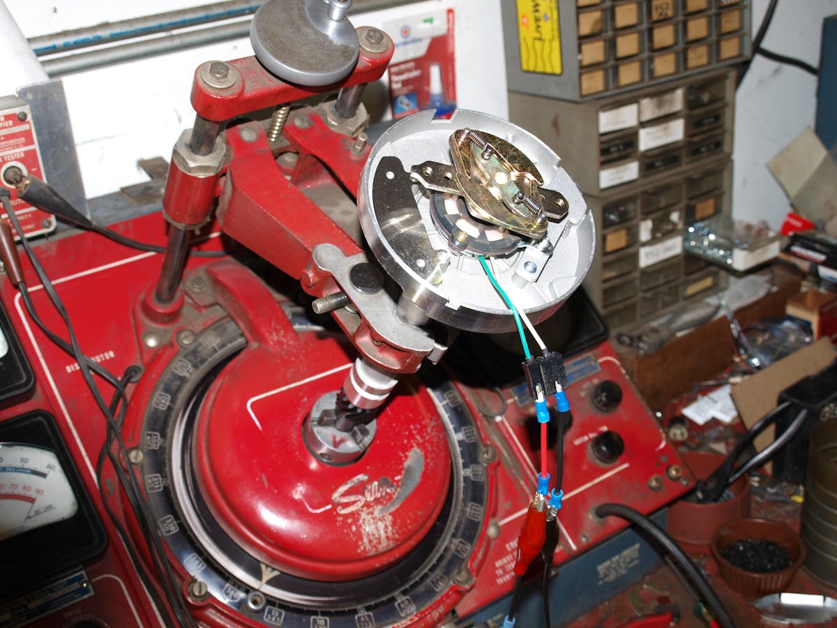 Smooth operation of the mechanical advance is checked after assembly of each distributor. Springs of various strengths are selected to provide the desired mechanical advance as part of tuning the overall ignition advance curve on the Sun distributor machine.