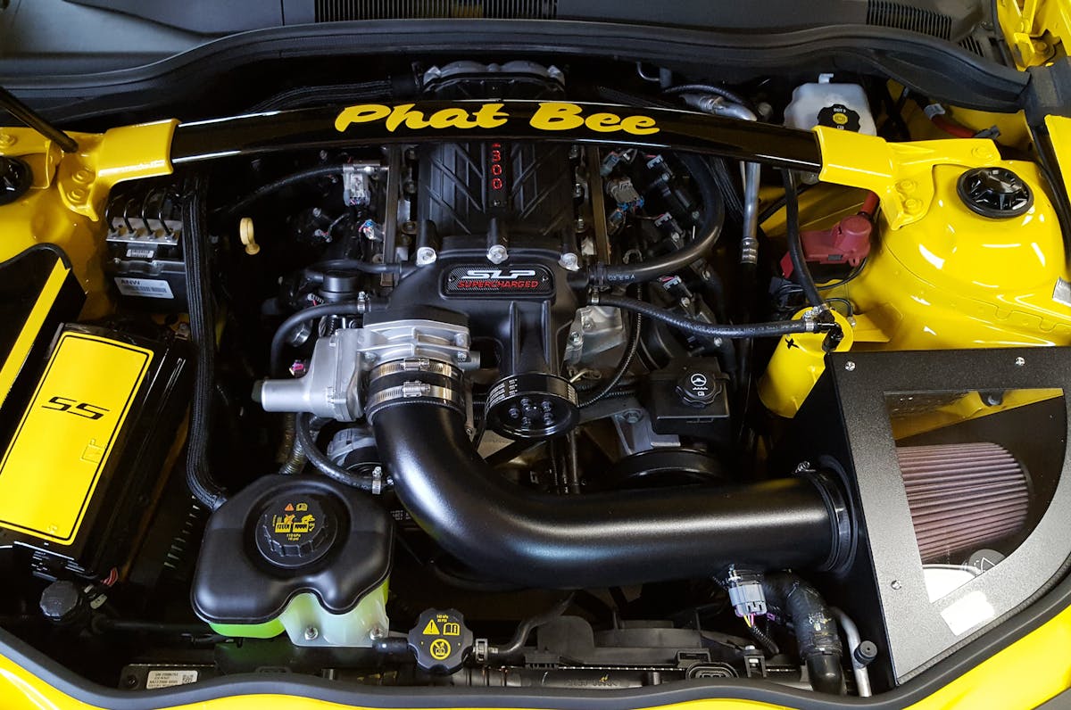 Tom Stahl’s “Phat Bee” is a 2012 Transformer Edition Camaro SS (in 2SS trim) with a Street Legal Performance TVS 2300 supercharger making 7 psi of boost.