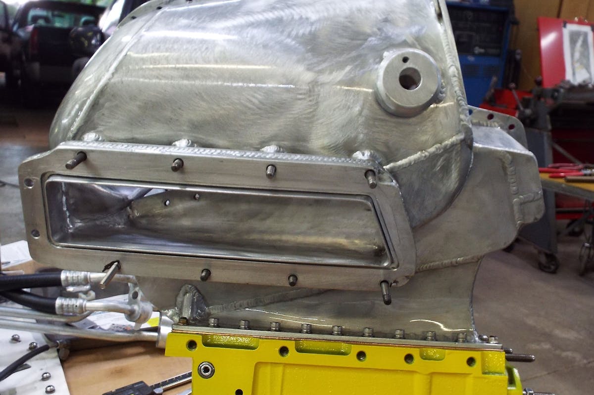 To solve the problem, Dreisbach tapped into the pressurized engine oil from the port behind the intake and plumbed it into the blower mount plate, where it enters cavities in the snout.”That directs the oil to the bearings first, then fills the gear cavity. When the level of the oil in the cavity gets to just below the seal, it is allowed to exit a larger port that is plumbed so it can drain into and through the valve cover and down into the lifter valley.”