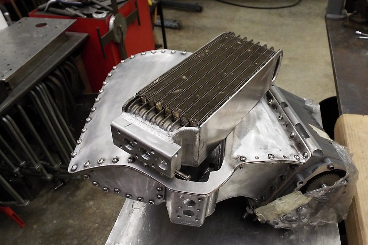Turning to his IndyCar experience, Dreisbach made a heat exchanger core from a high-fin-density Marston core that was originally part of a 1996 Lola ChampCar engine radiator. “It was made to be a double-pass cooler, and it has aerodynamic tanks for better airflow. Also, there is a reservoir that holds a stock Lightning intercooler pump that is low in front of the left front tire with a titanium stone shield.”