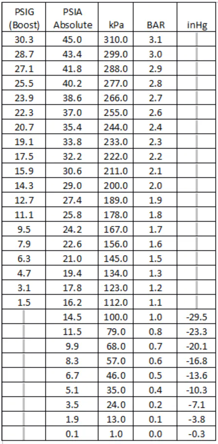 - PSIA = Pressure Absolute (Boost + Atmospheric Pressure)