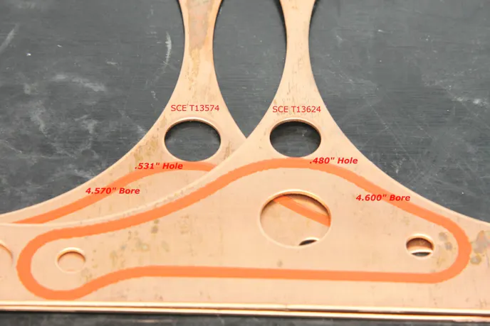 On the left is an SCE Titan copper head gasket with a 4.570-inch bore diameter and .531-inch bolt holes to clear ½-inch head studs (PN T13574). On the right is SCE’s larger 4.600-inch bore gasket but with smaller .480-inch holes that will only clear 7/16-inch head studs (PN T13624). Note how the material remaining between the bore and head stud hole is close to the same width in either gasket. If you tried to run a ½-inch heads stud in the 4.600-bore gasket on the right, the gasket margin would be too thin to maintain a good O-ring seal. Luckily, SCE won’t even sell you such a head gasket, so you don’t really have to worry about making this mistake. And don’t even think about drilling one out yourself. It’s just good knowledge to have.