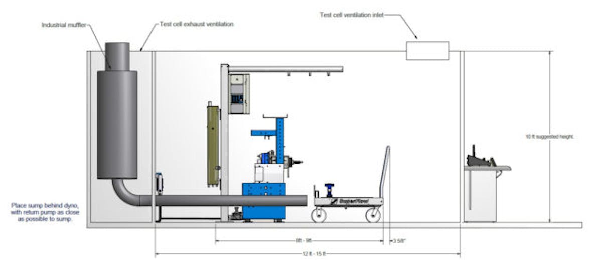 You’ll also need to factor in the operator’s console into your planning. This area will be located outside of the test cell for safety reasons, as a failure could result in parts flying out radially from the engine and injure the operator. “We recommend that the operator sit in-line with the crankshaft for maximum safety,” notes Mike Giles of SuperFlow. “We also do not recommend installing a viewing window that faces the sides of the engine, as that can be a safety risk if a projectile impacts the glass and shatters it.”