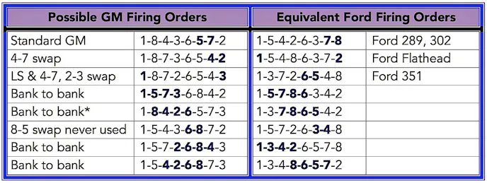 The other four possible combinations alternate individual cylinder firings between the banks except when adjacent cylinders fire. As you can see from the chart, three firing orders are used today by automakers and custom engine builders, and one has yet to earn favor with the industry.