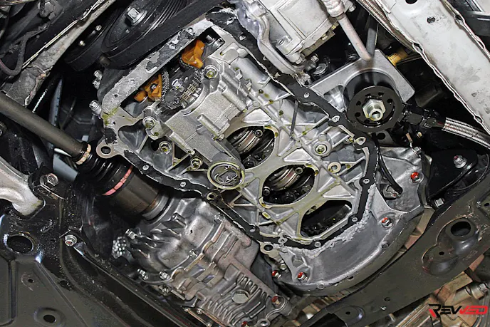With the studs in, fresh silicone gasket material was applied and smeared to cover the whole pan rail to ensure a tight seal. After that, we fit the pan over the studs, and started securing the pan with the supplied nuts, removing the excess gasket material that oozed out while tightening the fasteners.