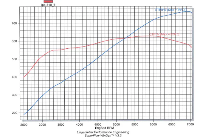 Using a set of in-house dyno headers and 100-octane race gas, the engine made a stout 764 horsepower at 7,000 rpm and 628 lb-ft of torque at 5,900 rpm — with more than 500 lb-ft from 2,900 rpm all the way to rev-limit.