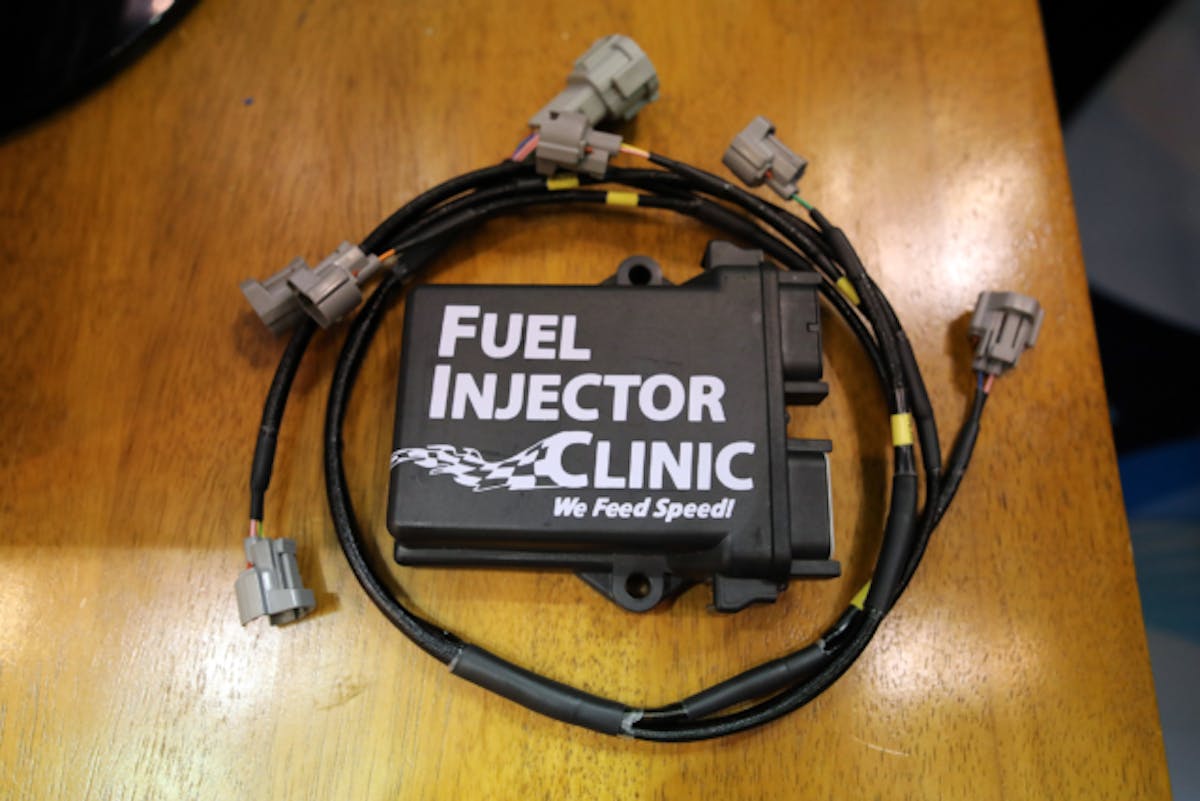 The point of this new system is to let a performance-enhanced engine run DI injectors during low pulse width operation, which will help in idle and low-demand situations, and then use the secondary port fuel injection system to supply fuel for high fuel demand situations typically seen when a power adder is used. The system uses all proprietary internals developed at Fuel Injector Clinic, and with the help of the external controller it intercepts the DI signal and runs independently of the factory ECU.