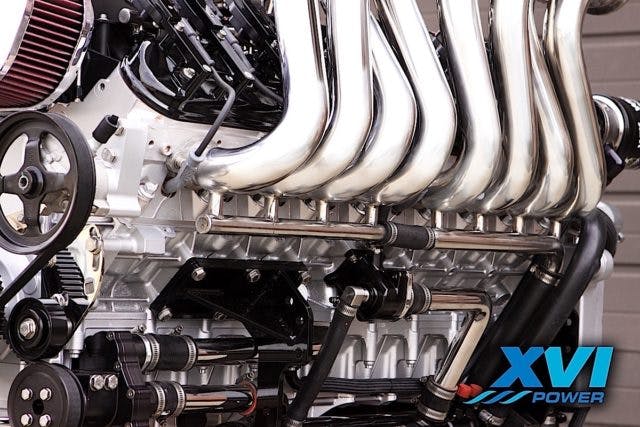 This dyno configuration is basically a LS3 setup that would be good for 550 horsepower in a street V8 application. Consider that twin-turbo LS drag engines are making upwards of 2,500 horsepower, it’s conceivable that a properly equipped V16 would make close to 5,000 horsepower. Steve Morris has already demonstrated that his quad-turbo Devel Sixteen engine, which is loosely based on LS architecture, can surpass 5,000 horsepower in full race trim.