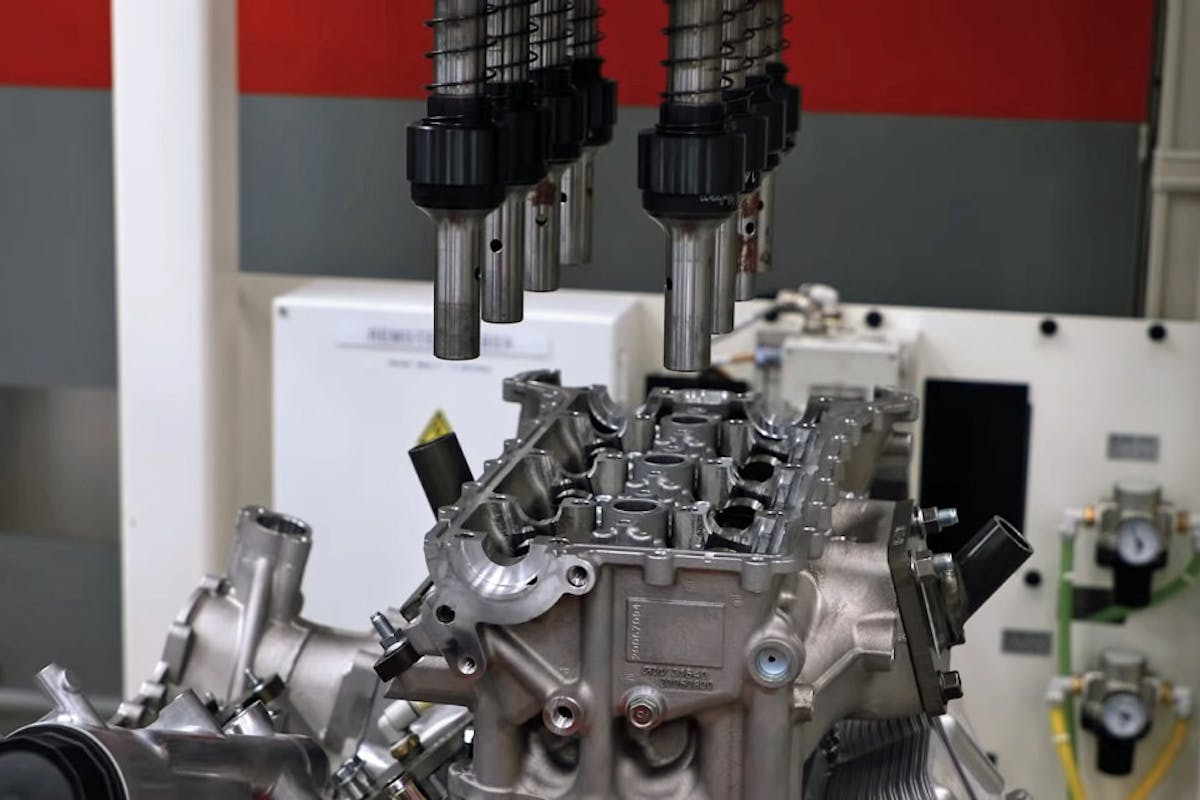 As noted in the video above, Acura is proud of its mix of traditional hand-crafted engine building as well as the modern assembly technology they have incorporated into the process. There are 547 fasteners on the NSX engine, and each one is started by hand. However, in order to ensure a perfectly even cylinder head deck, a multi-spindle nut-runner is used, so that not only is the correct torque applied every time, but that torque is applied to the fasteners simultaneously.