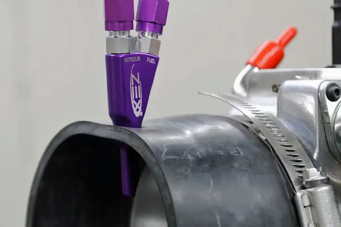 With that test complete, it was time for the chemical horsepower. Using a simple Zex single-nozzle wet nitrous system – capable of an advertised 75-125 horsepower gain – plumbed into the rubber hose coupler just before the throttle body, Holdener jetted the nozzle for the 125-horsepower jetting.