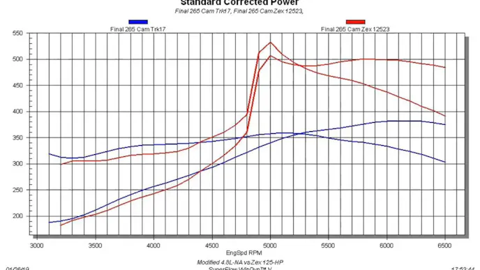 For upgrades, Holdener kept it simple and affordable, limiting it to just a cam swap and a Zex wet nitrous kit. For the camshaft, Holdener chose a Comp XFI RPM hydraulic roller camshaft (P/N: XR265HR). Labeled as “good torque and very strong mid-range power”, the XR265HR cam profile is designed to operate in the 1,200-6,000 rpm range, with .522 inch of lift on the intake and .529 inch on the exhaust, with 212 degrees of duration at .050 on the intake and 218 degrees on the exhaust side, with a 114-degree lobe separation angle.