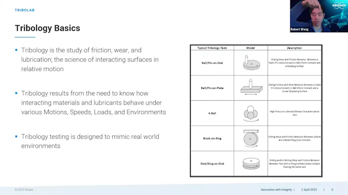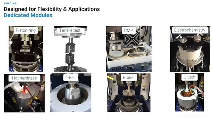 The Bruker Tribometer, which has been around for over 15 years, is a modular friction and wear tester that allows for the testing of different motions and conditions in one system, making it useful in the automotive industry, where there are many different moving parts. This flexibility allows you to test various types of motion, such as rotary, reciprocating, linear, and block-on-ring. The Tribolab model is configurable to simulate a wide range of tribology and mechanical tests in real-world conditions. It has the ability to test in oil at temperatures from 1,200 degrees-Centigrade to -40 degrees, and variable humidity, allowing you to test parts in the environment they will be in when in use.