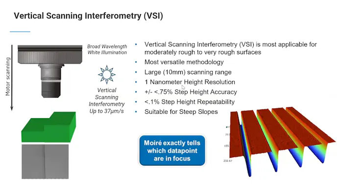 Interferometry is a technique used for 3D profilometry, looking at a system at an atomic level, and analyzing the small hills and bumps on the surface, producing a 3D image of the surface. Having this level analysis of small features such as surface finish, plays a big role in determining friction and drag, even at high speeds.