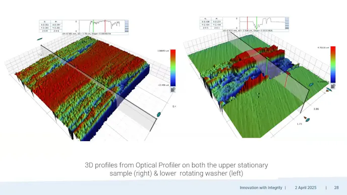 By using a profilometer (a device that measures the surface finish at a microscopic level) or tribometer (a device used to measure the friction and wear between two surfaces), you can speed up the testing process, reducing how much live testing must be done. A tribometer can help predict which combinations of materials work best, saving time and money with active vehicle testing.