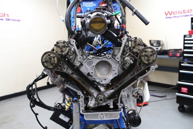 Installing camshafts on a Coyote is a hell of a lot easier to do on an engine dyno than in the car, though a seasoned installer can perform a cam swap in about three to four hours. Double that when it comes to replacing 32 valve springs on the engine.