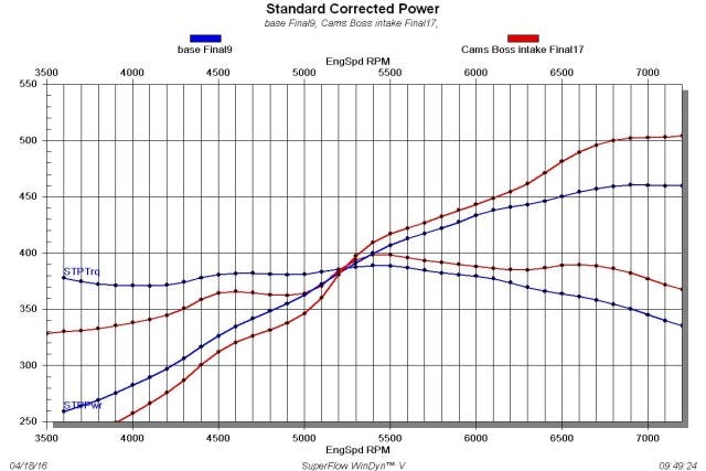 While installing camshafts in a Coyote isn’t for the faint of heart, it’s also not overly complicated. Having an engine that doesn’t need to be degreed makes installing camshaft upgrades in Coyotes fairly straight forward. In a matter of two hours we were able to pick up 50 horsepower to the crank while pushing our peak power up 700 rpm. We have to say that we are more than happy with what we achieved from our day on the dyno!