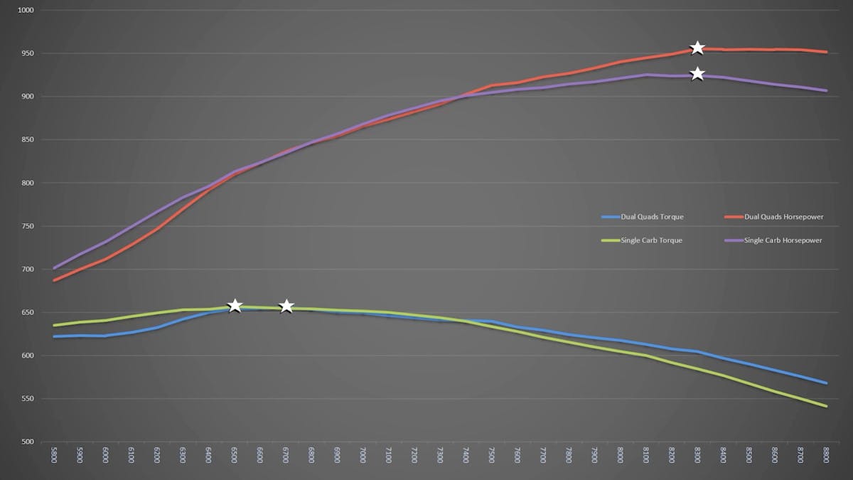 Since the R07 has no provisions for an internal oil pump, a six-stage dry-sump system was fitted for the dyno session. A set of race-style 1-7/8-inch stepped-primary headers were fitted for the dyno testing, as well. Once broken in, the engine was spun all the way up to 8,800 rpm on the dyno, with impressive results. The dual-quad setup yielded a peak of 955.1 horsepower at 8,300 rpm and 655.5 lb-ft of peak torque at 6,700 rpm.