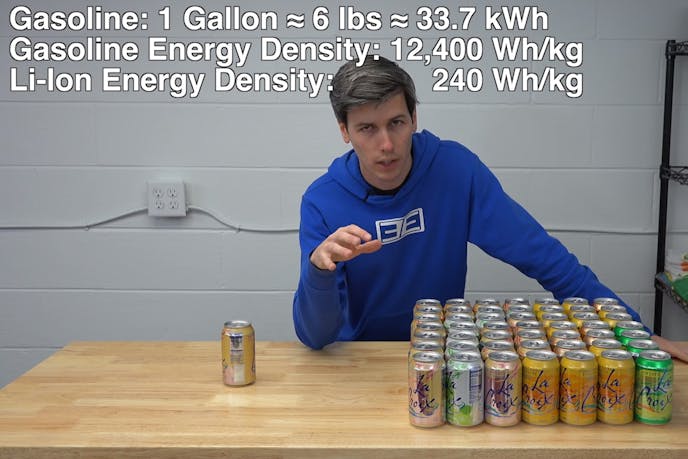 One gallon of gasoline weighs six pounds but produces 12,400 watt-hours per kilogram (Wh/kg) versus 240 Wh/kg for lithium-ion battery cells. That means internal combustion engines have far more power density for the same weight.