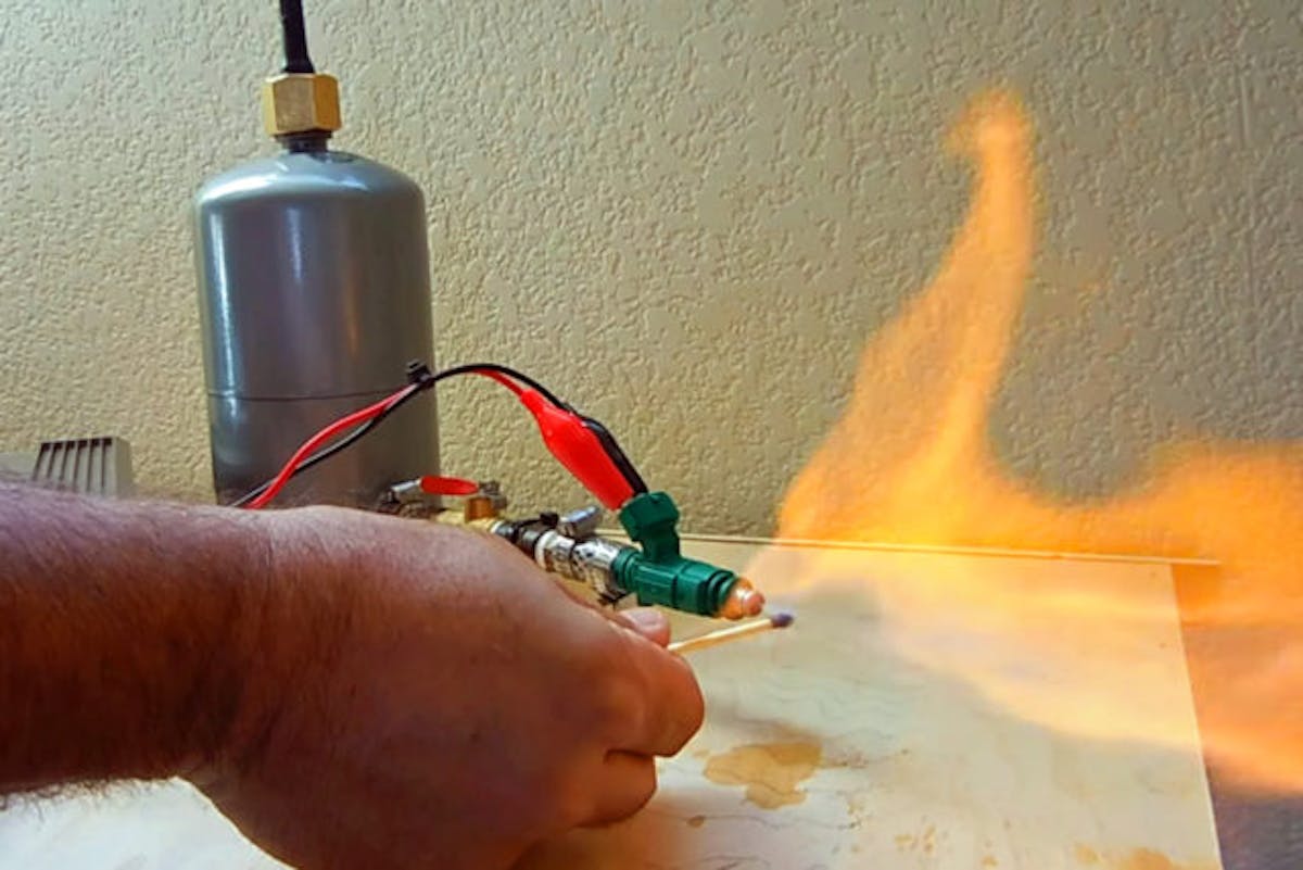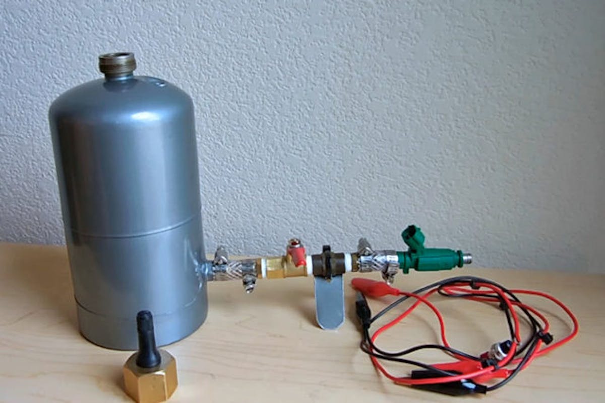 Then to attach the fuel injector to his pressure vessel, an assortment of fittings and tubing that were laying around were used. As the video’s creator noted, there are many ways to skin that cat, and he chose the cheapest route, which is mostly hose clamps and reinforced tubing. The one part that is pretty important and probably won’t be lying around is the quarter-turn shut-off valve, which is critical in order to be able to swap injectors while the system is pressurized.