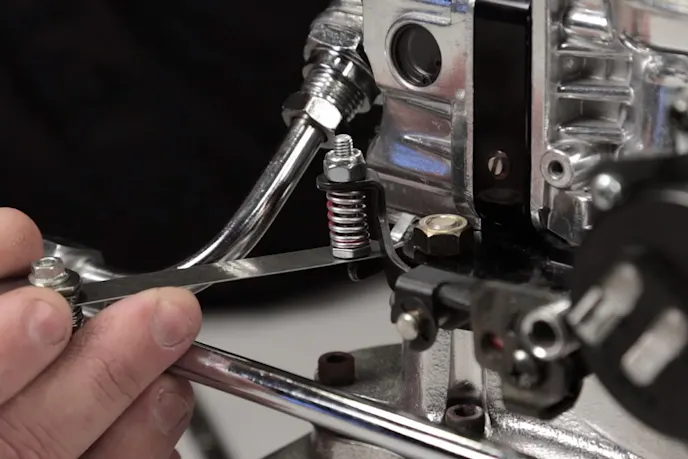 The first step is to adjust the accelerator pump actuation arm and the pump’s lever. To do that, you can use an open-ended wrench and a nut driver, or a pair of wrenches. Once you have all the slack taken out of the engagement with the system closed, making sure not to impart any preload on the lever, you then insert a .015-inch feeler gauge, and crank the carburetor to wide-open throttle.