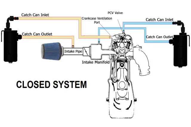An open catch can system is popular on cars with built motors and high boost because the PCV valve is deleted to allow for a greater volume of air to pass through the system. Because the PCV valve is removed, positive manifold pressure can no longer be blocked from entering the crankcase like on the factory system or a closed catch can. This means that the vent ports are routed into the catch can, like normal; but after the oil, water, and fuel are captured, the air is vented directly to the atmosphere through a filter and the inlet ports on the manifold and intake are capped off.
