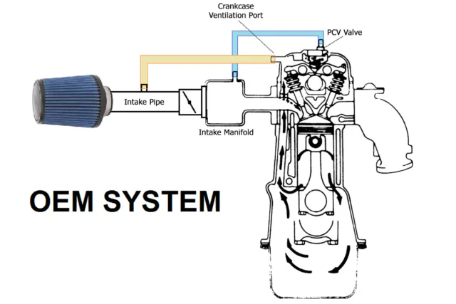 Most factory crankcase ventilation systems work by pulling fresh air into the crankcase from the intake tube using the CV port and recycling the blow-by vapors into the intake manifold, via the PCV valve. The PCV valve is designed to only open when the air pressure in the intake manifold is lower than in the crankcase, creating a vacuum to pull the vapors into the manifold and back to the combustion chamber again.